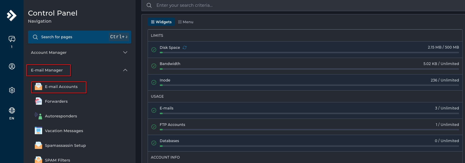 Na het inloggen, zoekt u naar de sectie "E-mailbeheer" of "E-mail Accounts" in het hoofdmenu van DirectAdmin.